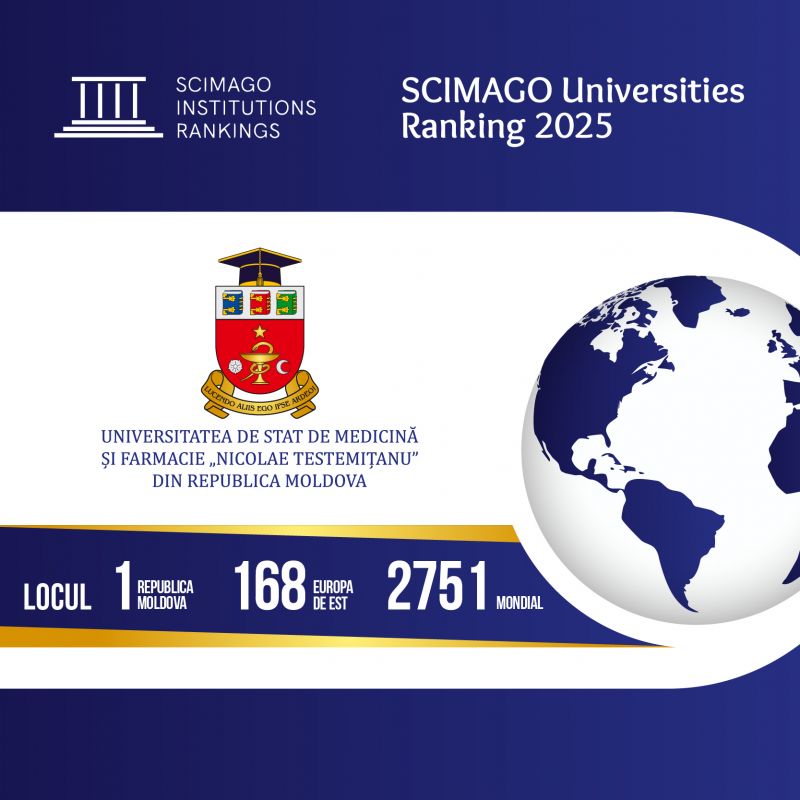 According to SIR, Nicolae Testemitanu University ranks 2751st globally among the 5051 higher education institutions (advancing 349 positions compared to 2024) and 168th among the 476 universities from Eastern Europe included in the ranking (39 positions up compared to last year) and occupies first place nationally among the 3 higher education institutions.