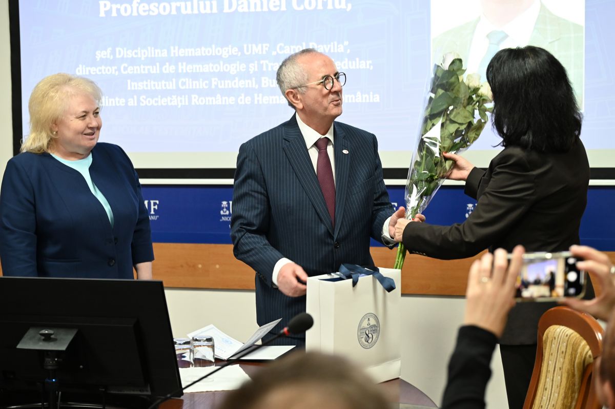 Daniel Coriu a mulțumit pentru încrederea acordată și pentru șansa de a face parte din comunitatea academică a USMF „Nicolae Testemițanu”, accentuând că colaborarea dintre cele două societăți de hematologie are cel puțin 10 ani. „În această perioadă am instruit în spitalul Fundeni colegi mai tineri de la Chișinău, am organizat manifestări științifice comune, am participat în diverse proiecte de cercetare. Noi avem un drum comun și vă asigur că voi depune toate eforturile ca această colaborare să fie una de durată, inclusiv în procesul de integrare europeană pentru care este necesar sprijinul nostru”, a subliniat profesorul român.
